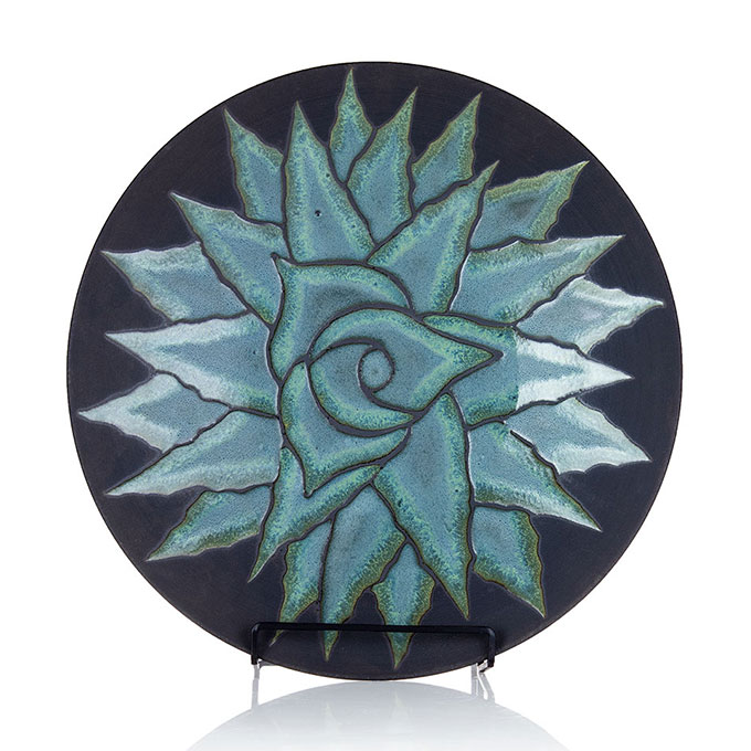 This hand-thrown bowl features and agave rosette design in deep blues and greens against a matte, black-stoneware background. And it’s big, measuring 16″ in diameter.