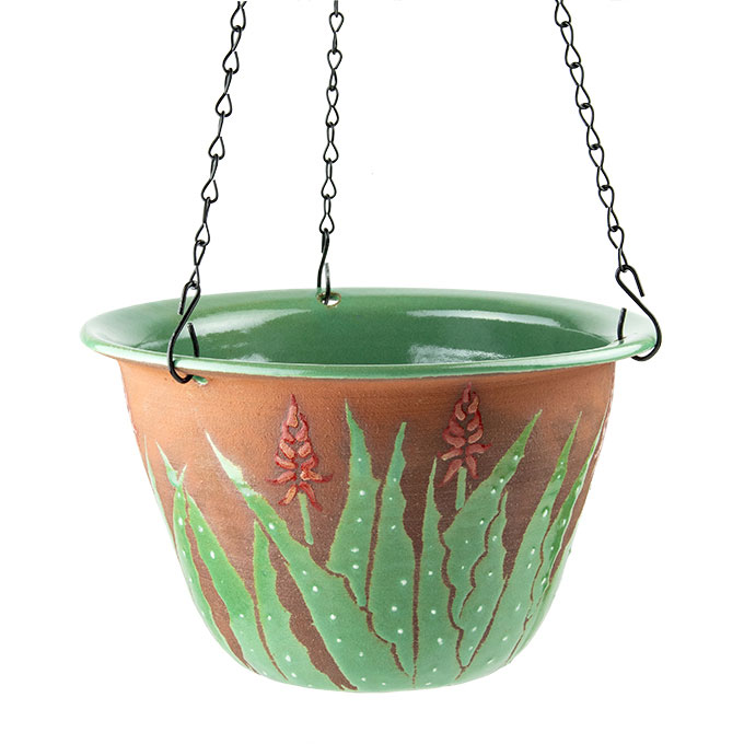 The bold shapes of the leafs and the deep reds of the flowers stand out handsomely against the black stoneware base of this attractive planter. Approximately 6” high the planter sits in a hand glazed saucer to catch any excess water. Nice Mother’s Day Gift we think.