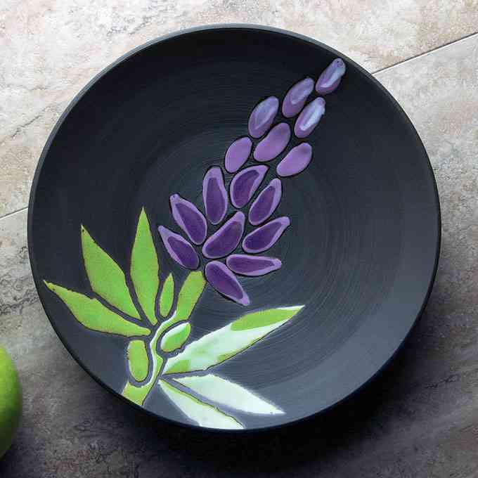 In years of abundant rainfall, the desert floor will be carpeted with the lovely blooms of the desert lupine. 2017 was one such year and the sight of that abundance lead to Jim’s newest pottery collection. This 9” bowl is hand painted on black clay which makes for a lovely contrast to the purple flowers and apple-green foliage.