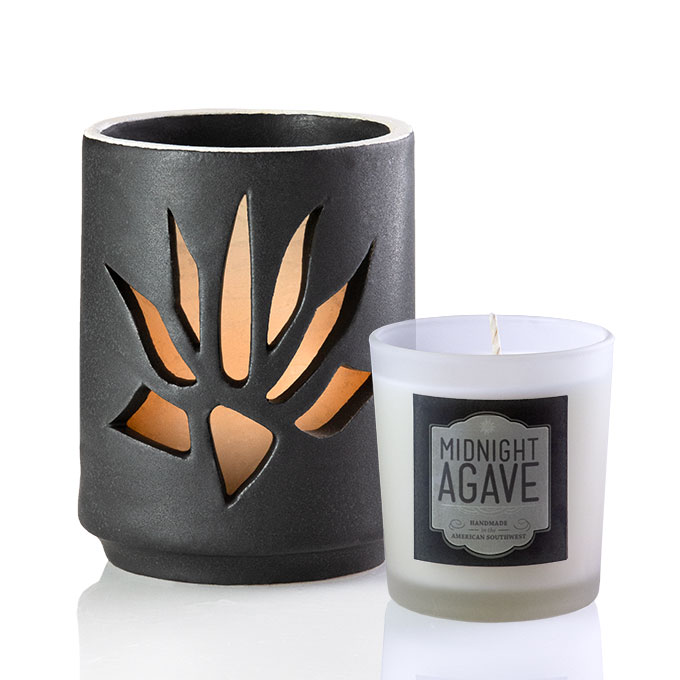 This wonderful hand-carved luminaria from Jim Sudal is just in time for the season of light. First, each luminaria is hand-built using white stoneware, with the bold agave design carved directly into the wet clay. Then each vessel is kiln fired using a black satin glaze, save the rim, which is glazed matte white. The finished dimensions are 5″ tall and 4″ in diameter.