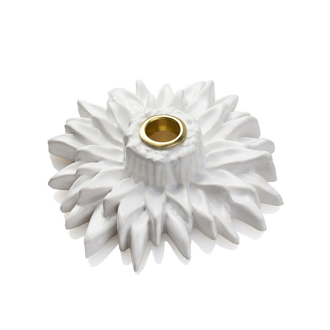 This lovely white candle holder is inspired by the bloom of the Arizona Queen of the Night cactus. It measures 7″ across and has a 1″ diameter brass insert that holds standard taper candles.