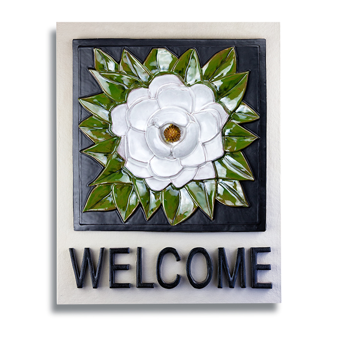 Greet your guests with this beautiful, contemporary welcome sign with raised Prickly Pear Cactus Design. The tile and welcome letters are kiln fired so they never fade. The 16” x 20” grey background is a composite of exterior grade plywood and tile backer board fused and sealed making it weather resistant. The piece arrives ready to hang, with a French cleat hanging system.